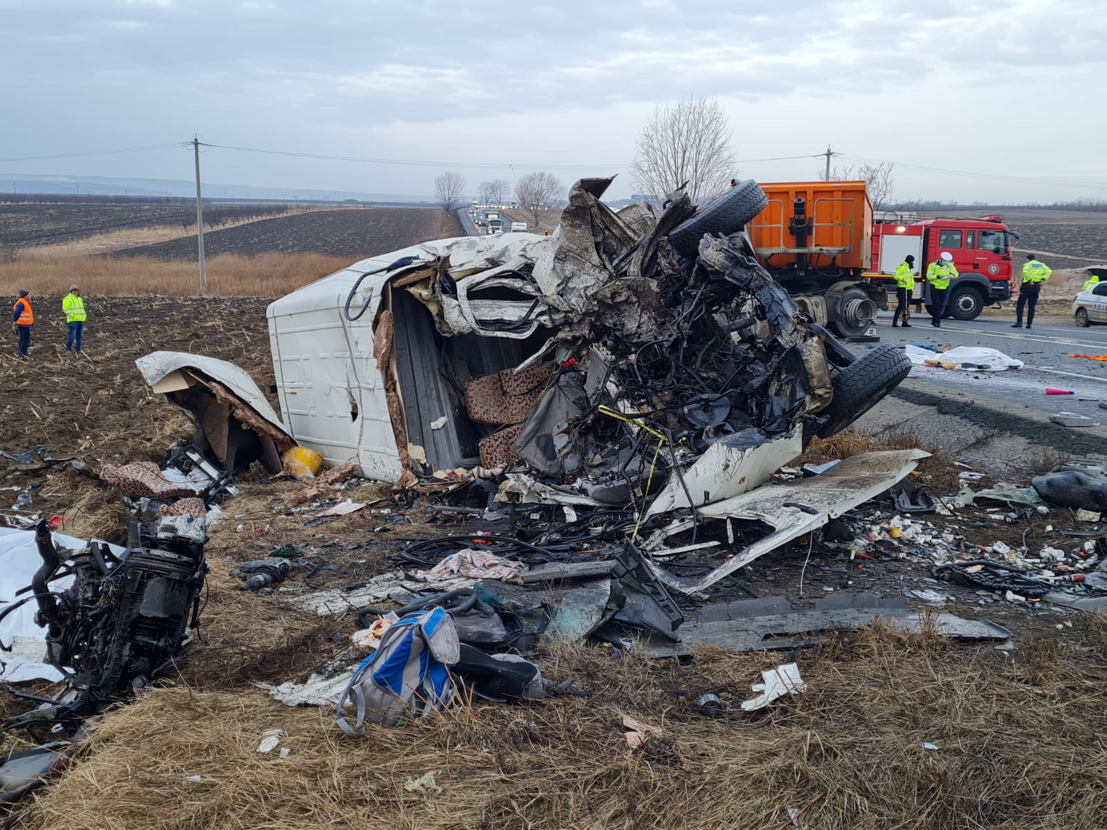 Din primele date, un autocamion intră pe contrasens, acroșează o ambulanță, apoi intră în coliziune frontală cu o autoutilitară.