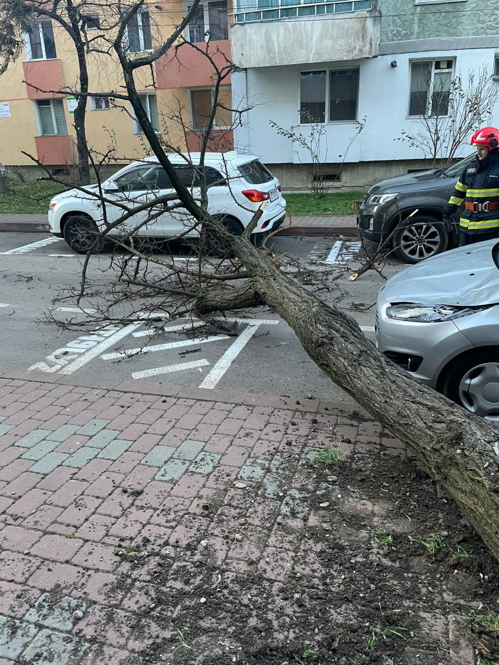Se intervine si pe strada Anton Vorel pentru îndepărtarea unui arbore căzut pe carosabil după ce a lovit un autoturism.