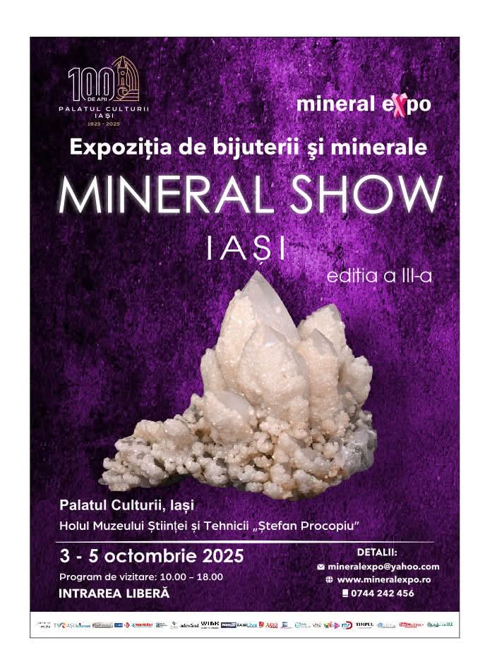 În perioada 3 – 5 octombrie 2025, publicul din Iași este invitat să participe la cea de-a III-a ediție a „#Mineral #Show #Iași”, un eveniment unic dedicat bijuteriilor și mineralelor, ce va avea loc în impunătorul Palat al Culturii, în Holul Muzeului Științei și Tehnicii „Ștefan Procopiu”.