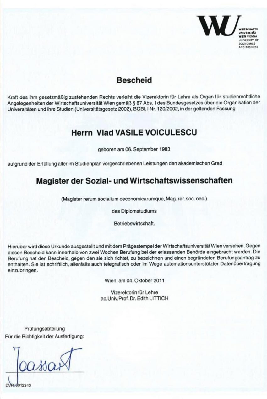 După mai multe zile de speculații intense, ministrul Sănătăţii şi-a postat pe Facebook, marţi seara, diploma de studii, eliberată de Vienna University of Economics and Business.Vlad Voiculescu a publicat și un atestat de echivalare a actului cu o diplomă de master în domeniul administrarea afacerilor.Documentul de atestare poartă sigla Centrului Naţional de Recunoaştere şi Echivalare a Diplomelor din cadrul Ministerului Educaţiei Naţionale şi a fost eliberat în ianuarie 2016.
