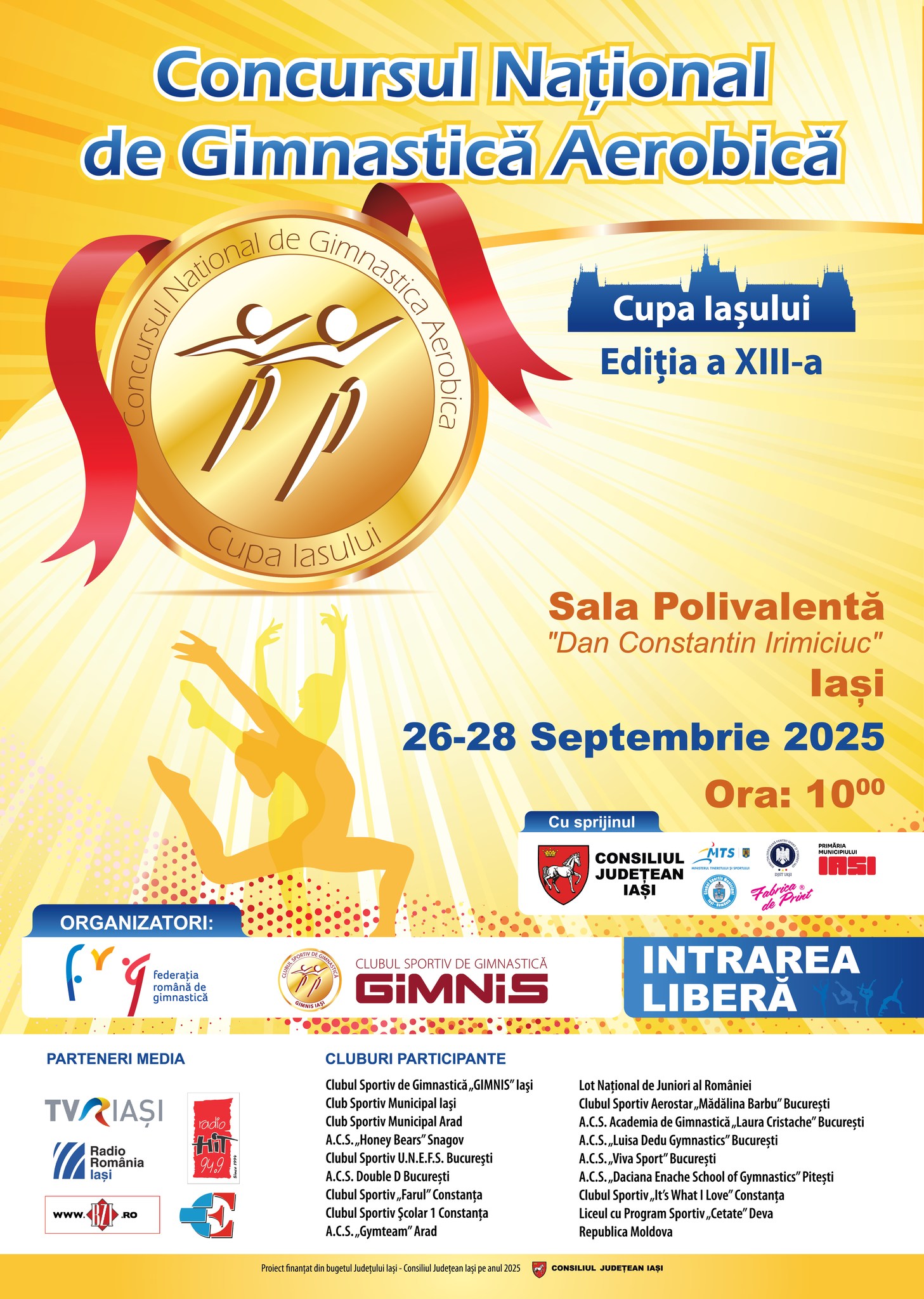 Clubul Sportiv de Gimnastică GIMNIS Iași și Federația Română de Gimnastică organizează, cu sprijinul Consiliului Județean Iași, în zilele de 27 și 28 septembrie 2025, între orele 9.30-20.00, la Sala Polivalentă “Dan Constantin Irimiciuc” Iaşi, ediţia a XIII-a a Concursului Naţional de Gimnastică Aerobică “Cupa Iaşului”.