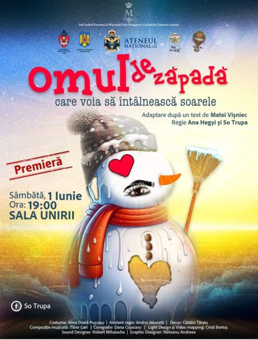 Sâmbătă, 1 iunie, de la ora 19.00, la Sala Unirii, Ateneul Național din Iași prezintă premiera spectacolului pentru copii Omul de zăpadă care voia să întâlnească soarele, adaptare după un text de Matei Vișniec, regie de Ana Hegyi alături de actorii So Trupa.
