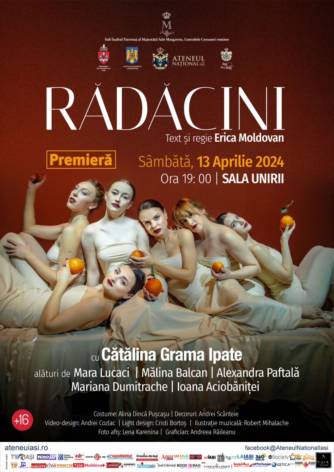 Ateneul Național din Iași prezintă luna aceasta premiera spectacolului de teatru Rădăcini, text și regie de Erica Moldovan, cu participarea actriței Cătălina Grama Ipate. Reprezentațiile vor avea loc pe 13 și 14 aprilie 2024, de la ora 19.00, la Sala Unirii.