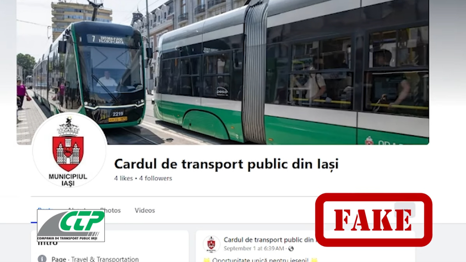 A apărut în mediul online o nouă pagină de Facebook înșelătoare, care direcționează către un site neoficial, utilizând ilegal sigla Primăriei Iași și a Companiei de Transport Public Iași, promovează carduri de transport false, invitându-vă să faceți achiziții printr-un link fraudulos.