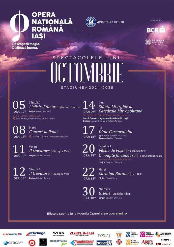 Biletele de intrare la reprezentațiile lunii octombrie pot fi achiziționate începând de luni, 23 septembrie, ora 12:00, de pe operaiasi.ro și de la Agenția de bilete, situată în foaier.