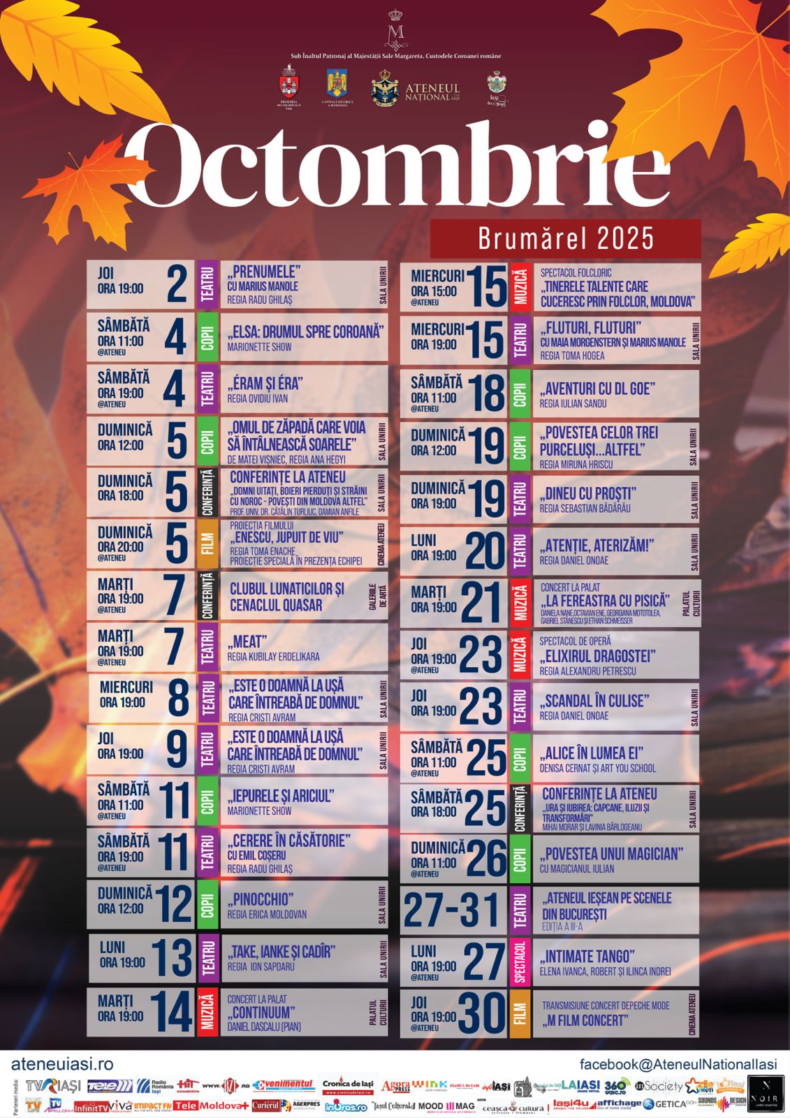 Programul pentru adulți este la fel de variat. Octombrie aduce spectacole din stagiunea curentă a Ateneului, dar și producții cu invitați speciali. Printre acestea se numără „Prenumele”, cu Marius Manole, sau „Fluturi, fluturi”, cu Maia Morgenstern și Marius Manole – spectacole foarte apreciate de public. Vom regăsi și premierele de anul trecut, dar și conferințe, spectacole de dans și concerte, pentru o lună cu adevărat bogată în evenimente culturale.