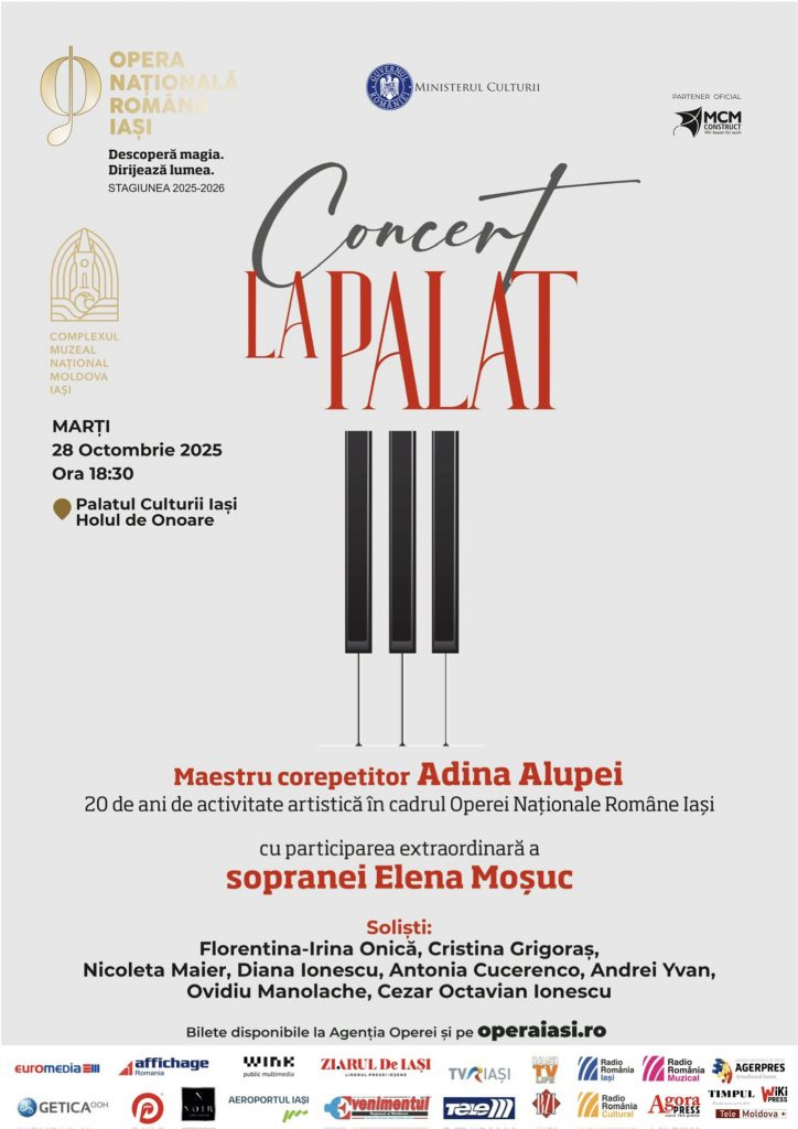 Sub cupola impunătoare a Palatului Culturii, muzica se pregătește să devină din nou poveste. Azi, de la ora 18:30, Opera Națională Română din Iași invită publicul la „Concert la Palat”, un eveniment aniversar dedicat pianistei și maestrului corepetitor Adina Alupei, o prezență discretă, dar esențială în viața artistică a Operei.