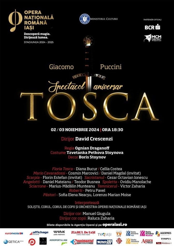 Opera Națională Română din Iași sărbătorește pe 3 noiembrie 68 de ani de la debutul său pe scena lirică ieșeană. Festivitatea va fi marcată prin prezentarea aceleași opere cu care a început călătoria sa, „Tosca”, de Giacomo Puccini. Această operă renumită, compusă din trei acte, va fi interpretată cu distribuții variate sâmbătă și duminică, începând cu ora 18:30, în Sala Mare.