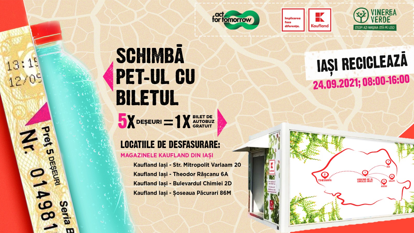 Locuitorii orașului Iași vor putea circula gratuit cu mijloacele de transport public, plătind la schimb cu PET-uri și doze de aluminiu. Această măsură face parte din Caravana Schimbă PET-ul cu biletul, o inițiativă dezvoltată pentru prima dată în România de Act for Tomorrow și Kaufland România în contextul programului Vinerea Verde, lansat de Ministerul Mediului, Apelor și Pădurilor. În Iași, campania se va realiza pe data de 24 septembrie, în intervalul orar 08:00-16:00, în toate parcările magazinelor Kaufland din Iași. Costul biletelor este suportat integral de către principalul partener privat al acestei campanii – Kaufland România. Toate PET-urile colectate în cadrul campaniei vor fi transmise către fabricile de reciclare.