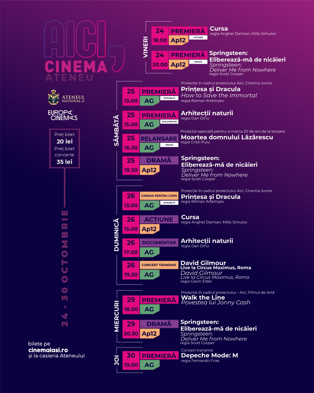 Finalul de octombrie aduce la Ateneul Național din Iași o selecție bogată de filme, concerte și activități culturale. De la proiecții românești și documentare internaționale, până la filme aniversare și producții pentru copii, Cinema Ateneu devine locul ideal pentru iubitorii de cinematografie.