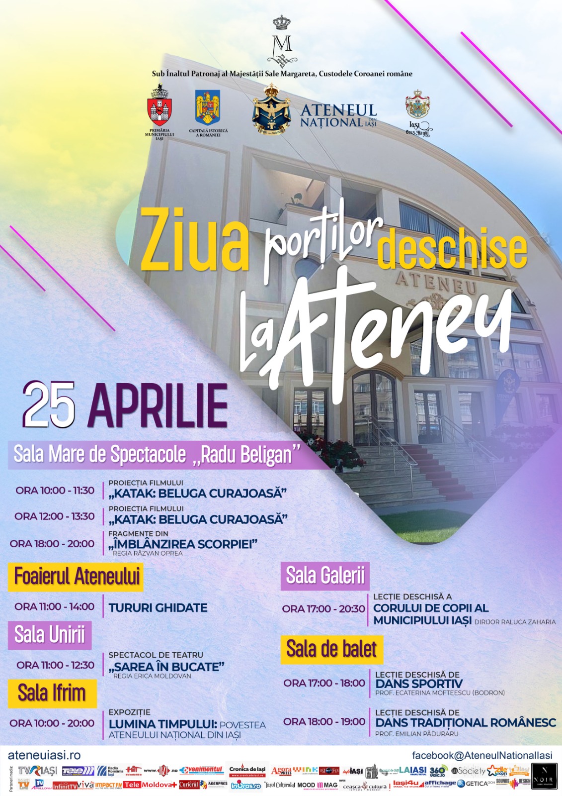 De Ziua Porților Deschise, la sediul Ateneului ieșean se vor organiza manifestări ce se adresează tuturor categoriilor de vârstă, incluzând activități diverse atât pentru cei mari, cât și pentru cei mici. Din foaier la sălile de repetiții și la scena mare, echipa ateneului a pregătit activități specifice prin care veți putea descoperi spațiul teatrului într-o nouă lumină. Astfel, pe parcursul zilei de 25 Aprilie, vor fi organizate expoziții, tururi ghidate, lecții deschise de dans și muzică, oră de make-up de scenă și o repetiție de regie cu public. Întregul program al evenimentului poate fi descoperit pe pagina de Facebook al Ateneului.