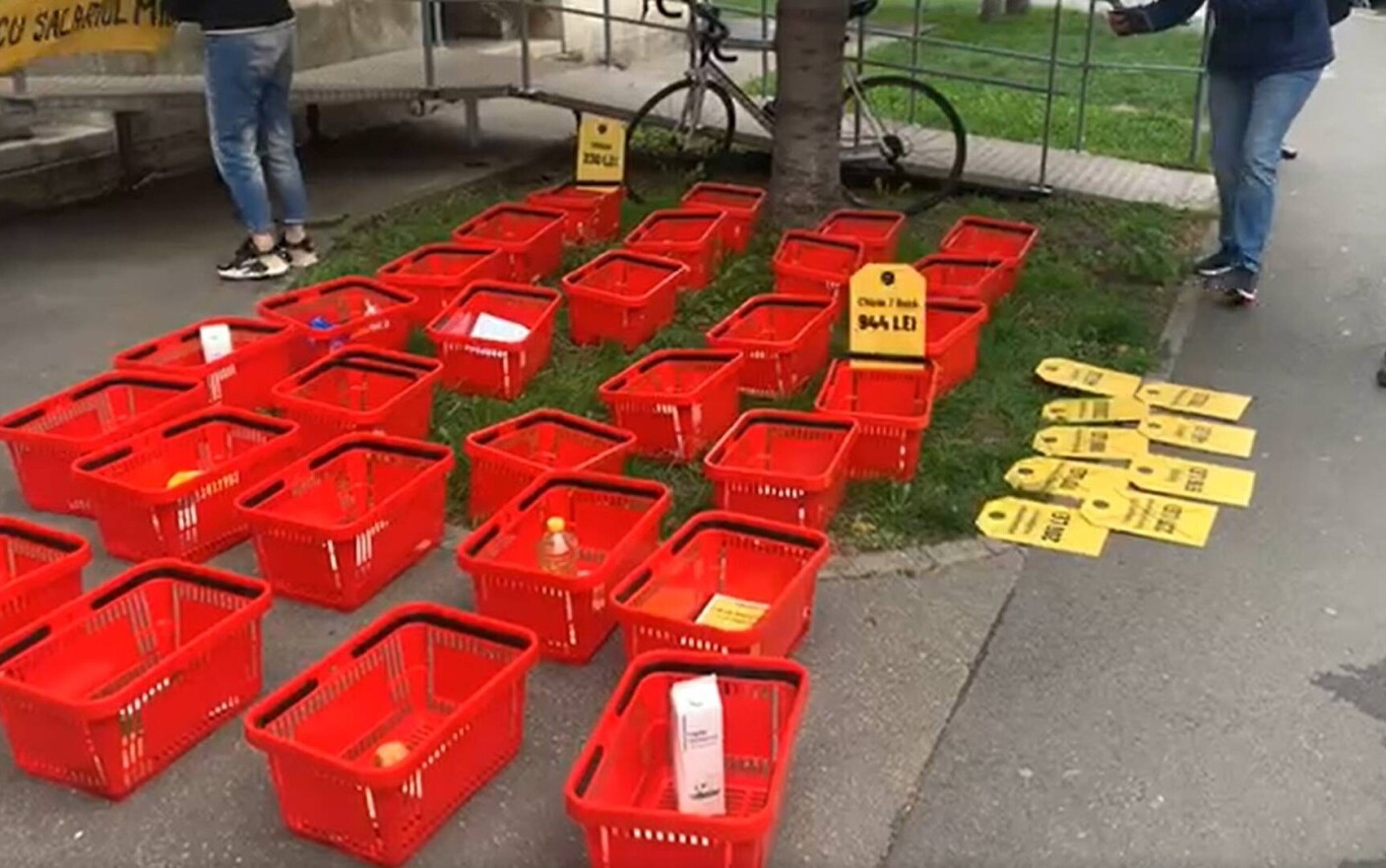 30 de coşuri de cumpărături au fost aduse de reprezentante la protest, în care au pus foarte puţine produse, pentru a demonstra că salariul minim permite angajatului să îşi acopere în fiecare zi a lunii foarte puţin din necesarul pentru un trai decent. Conform calculului Declic, salariul minim pentru anul viitor permite alocarea a doar 119 lei pe lună pentru igienă şi a numai 230 de lei pentru plata utilităţilor.