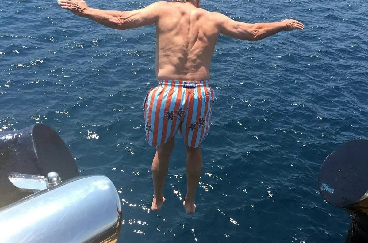 Actorul a demonstrat că vârsta nu i-a retezat îndrăzneala. Sub privirile uimite ale rudelor, actorul a sărit în apă de la aproape 9 metri înălțime.