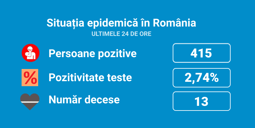Luni au fost raportate 415 de noi cazuri de COVID în România. În ultimele 24 de ore s-au înregistrat 13 decese. Numărul total de cazuri urcă astfel la 1.091.340, dintre care 34.425 au decedat, iar 1.052.055 au fost declarate vindecate. Pe de altă parte, 29 de persoane au fost reconfirmate pozitiv.