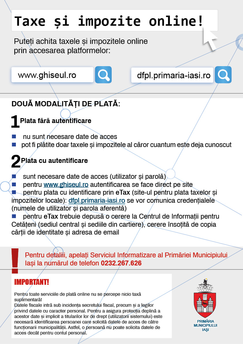 Plata impozitelor şi taxelor locale se poate efectua – simplu și rapid – și online, prin Sistemul Naţional Electronic de Plată Online www.ghiseul.ro sau prin secțiunea eTAX de pe site-ul Municipiului Iaşi, https://www.primaria-iasi.ro, astfel:
