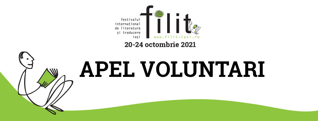 Festivalul Internaţional de Literatură şi Traducere Iaşi – FILIT, ajuns la cea de-a IX-a ediție, lansează apelul de recrutare voluntari pentru ediția de anul acesta, ce se va desfășura în perioada 20-24 octombrie 2021. Voluntarii vor face parte din departamentele: Invitați, Evenimente, Casa Muzeelor, Comunicare&Promovare, Foto-Video, Serile FILIT. Printre criteriile de selecție se numără disponibilitatea de timp, experiența anterioară și cunoașterea uneia sau a mai multor limbi străine.
