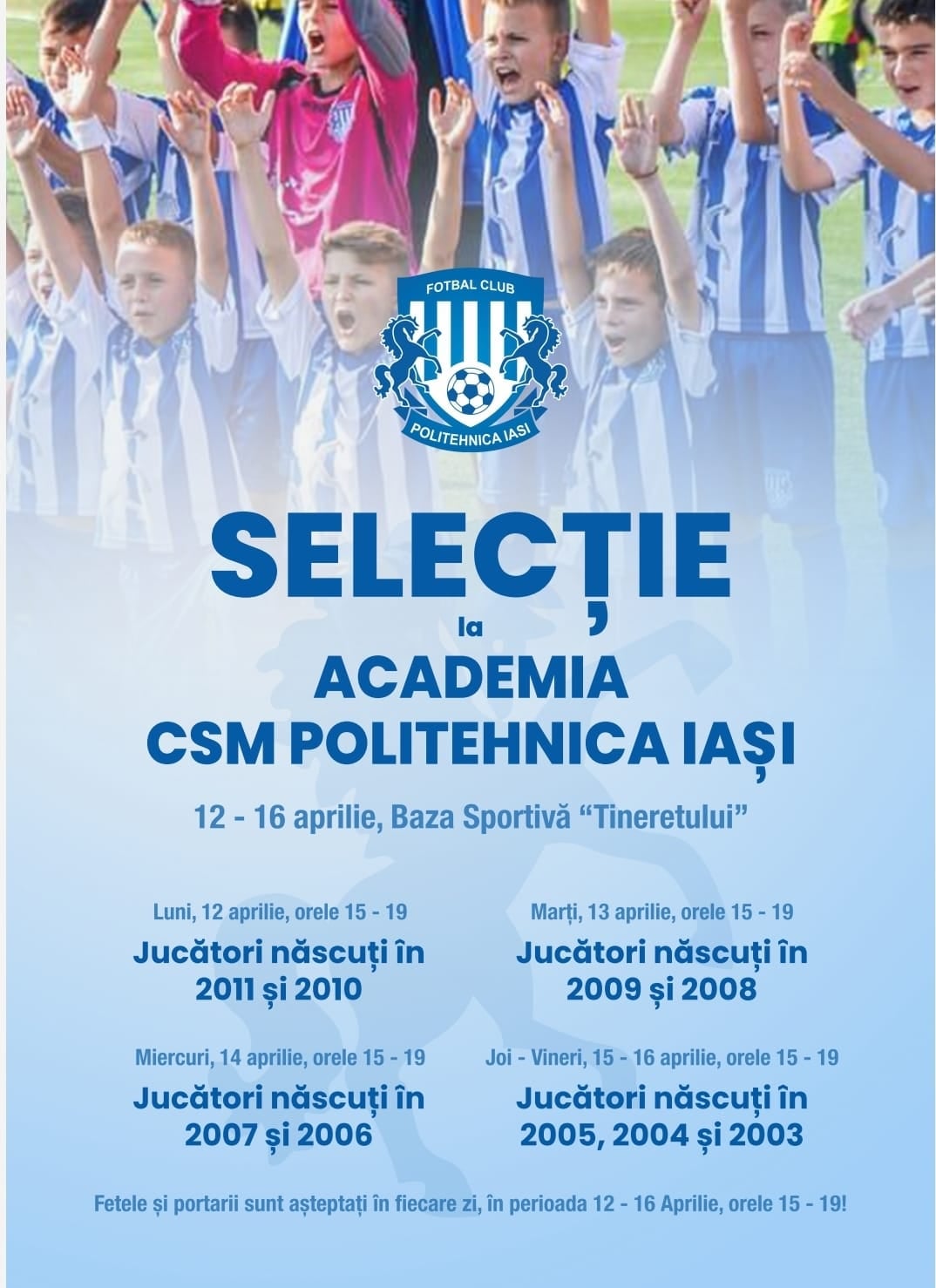 Academia de fotbal Politehnica Iași va organiza în luna aprilie acțiuni de selecție pentru copii și juniori, la mai multe categorii de vârstă. Selecția va fi organizată în perioada 12-16 aprilie, la Baza Sportivă Tineretului (terenul sintetic din Abator), zilnic între orele 15.00 – 19.00, după cum urmează: