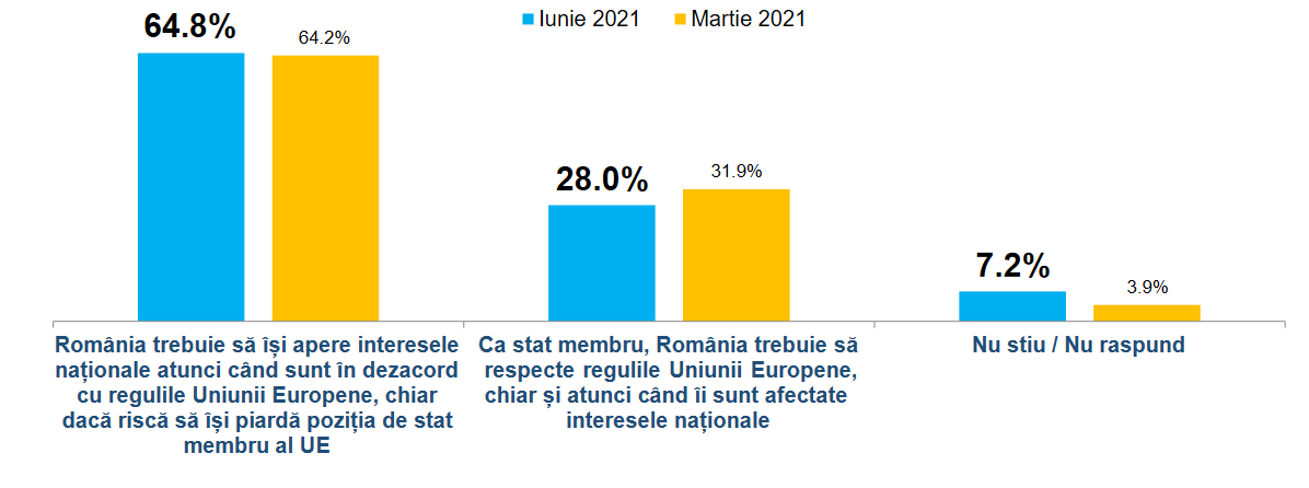 28% dintre români sunt de părere că România trebuie să respecte regulile Uniunii Europene, chiar și când îi sunt afectate interesele naționale (față de 31,9% în martie). 64,8% consideră că România trebuie să își apere interesele naționale chiar dacă riscă să își piardă poziția de stat membru al UE (față de 64,2% în martie). 7,2% nu știu sau nu răspund. Persoanele cu vârsta sub 30 de ani, locuitorii din București și din regiunea Nord Est consideră într-o proporție mai mare decât media că ieșirea din UE ar afecta interesele țării.