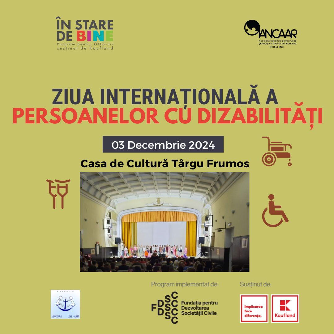 Asociația Națională pentru Copii și Adulți cu Autism din România (ANCAAR), filiala Iași și Fundația Ancora Salvării Iași au organizat, în data de 03 decembrie 2024, la Casa de Cultură ,,Garabet Ibrăileanu” (str. Cuza Vodă, nr. 10) din Târgu Frumos, între orele 10.00 – 11.30, spectacolul dedicat Zilei Internaționale a Persoanelor cu Dizabilități.