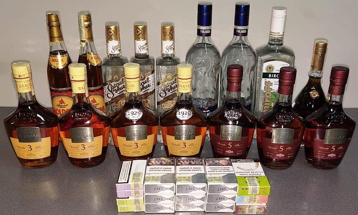 –în cazul celui de-al doilea bărbat, în vârstă de 28 ani: cantitatea de 12 sticle de 2 litri de vodcă de diferite mărci și cantitatea de 7.180 țigarete cu timbre de acciză R. Moldova.