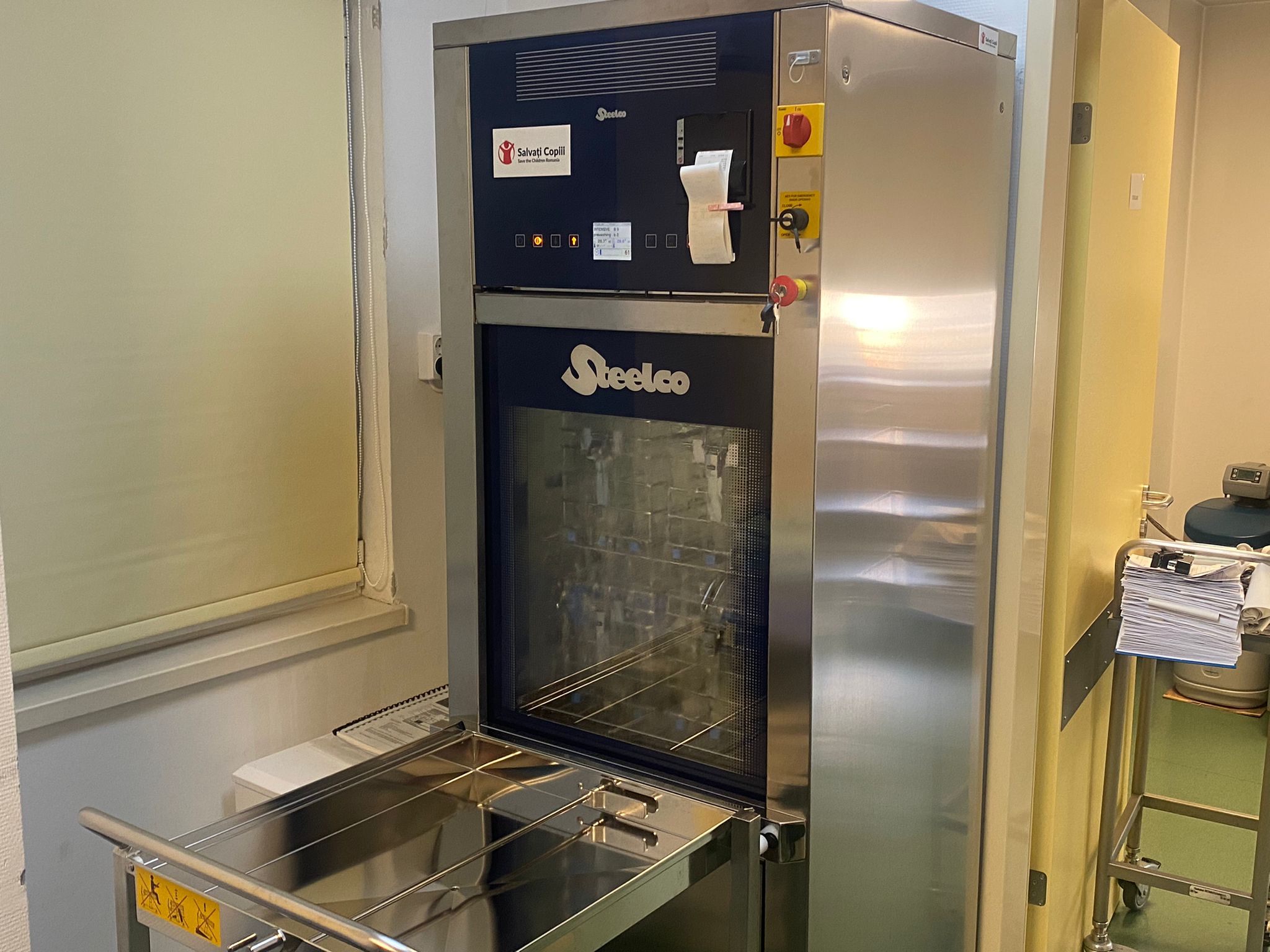 Noi încercăm să promovăm, este extrem de important de spus acest lucru, promovăm alimentația naturală pentru copiii foarte mici, chiar acel mililitru când se naște copilul, îl luăm și îi dăm lapte de mamă. În mod normal, un copil sănătos mănâncă de opt ori pe zi. Da, deci între întrei ore. Cei cu patologie pot să mănânce la 12h, la 6h, la 8h depinde de evoluția clinică a copilului, dar cert este că nu murdărești un biberon pentru mililitru. Dar facem absolut orice ca să promovăm alimentația pentru că ei trebuie să mănânce, să scape de perfuzie și de aia insistăm atât de mult pe acest aspect. Pe de altă parte, cei de la Salvați Copii ne-au donat un aparat de preparare a nutriției parenterale totale, este un adevărat robot. Ai pe un calculator, setezi ce necesar ai și trage automat substanțele active. Deci și ăsta este de extrem de important și ușurează munca și în primul rând reduce riscul de contaminare a soluțiilor. Deci clar este vital și acela și sterilizarea, pentru că era, de ce să ne ascundem după degete, speli biberonul cu peria, nu mai este cazul. Suntem în secolul XXI și am reușit cu sprijinul organizației Salvați Copiii să achiziționăm acest dispozitiv.