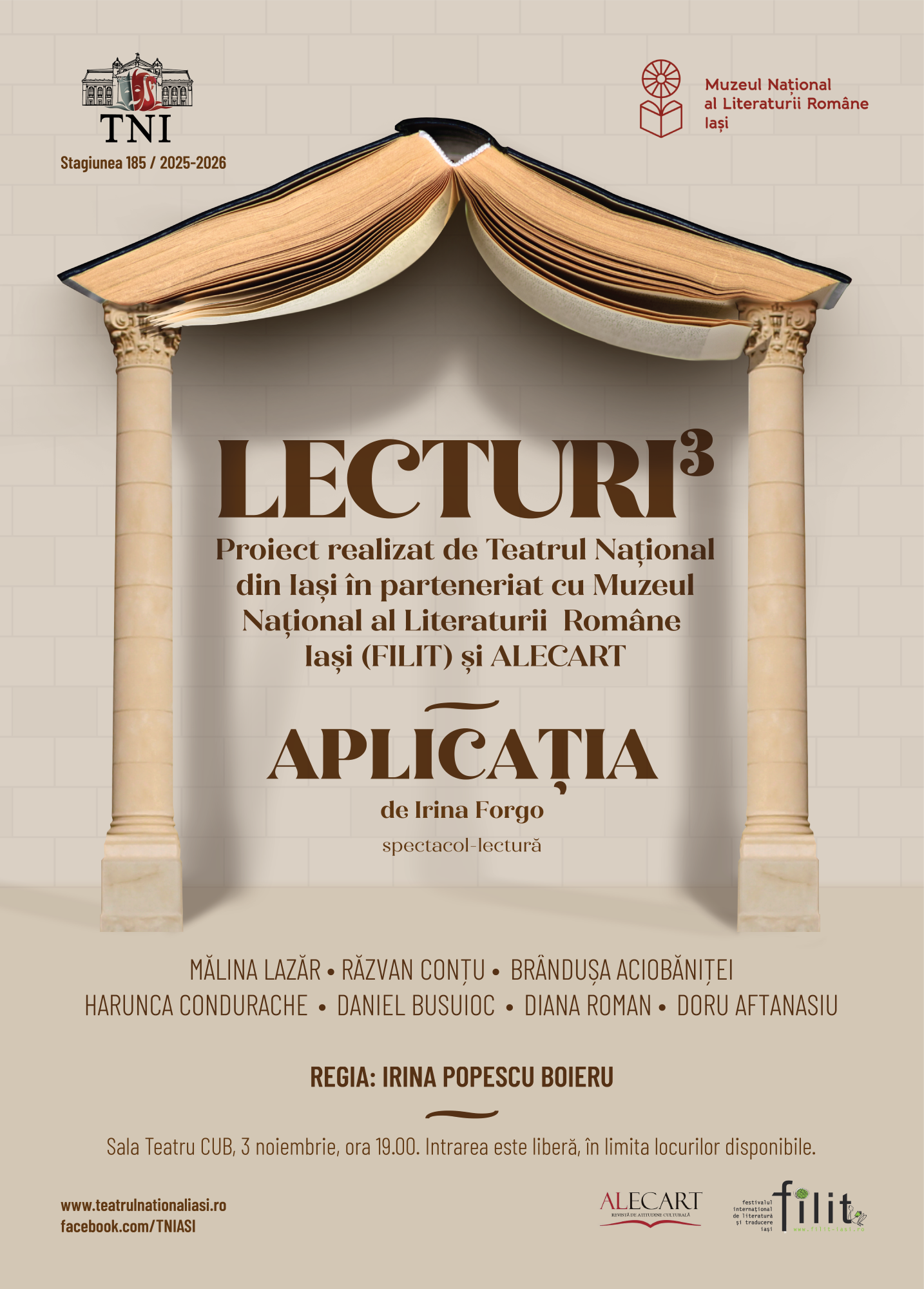 Luni, 3 noiembrie, de la ora 19:00, la CUB, Teatrul Național Iași invită publicul la primul spectacol-lectură din această stagiune, „Aplicația”, textul Irinei Forgo desemnat câștigător al lunii de către juriul „Lecturi³”. Regia spectacolului este semnată de Irina Popescu-Boieru, iar din distribuție fac parte actorii: Mălina Lazăr, Răzvan Conțu, Brândușa Aciobăniței, Haruna Condurache, Daniel Busuioc, Diana Roman și Doru Aftanasiu. Intrarea este liberă, în limita locurilor disponibile.