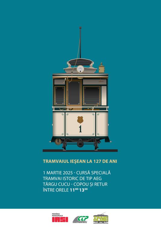 Compania de Transport Public Iasi sarbatoreste 127 de ani de transport electric cu Tramvaiul Mărțișorului, care Sâmbătă, 1 martie 2025, intre orele 11:00 – 13:00 va circula pe traseul Târgu Cucu – Rond Copou.
