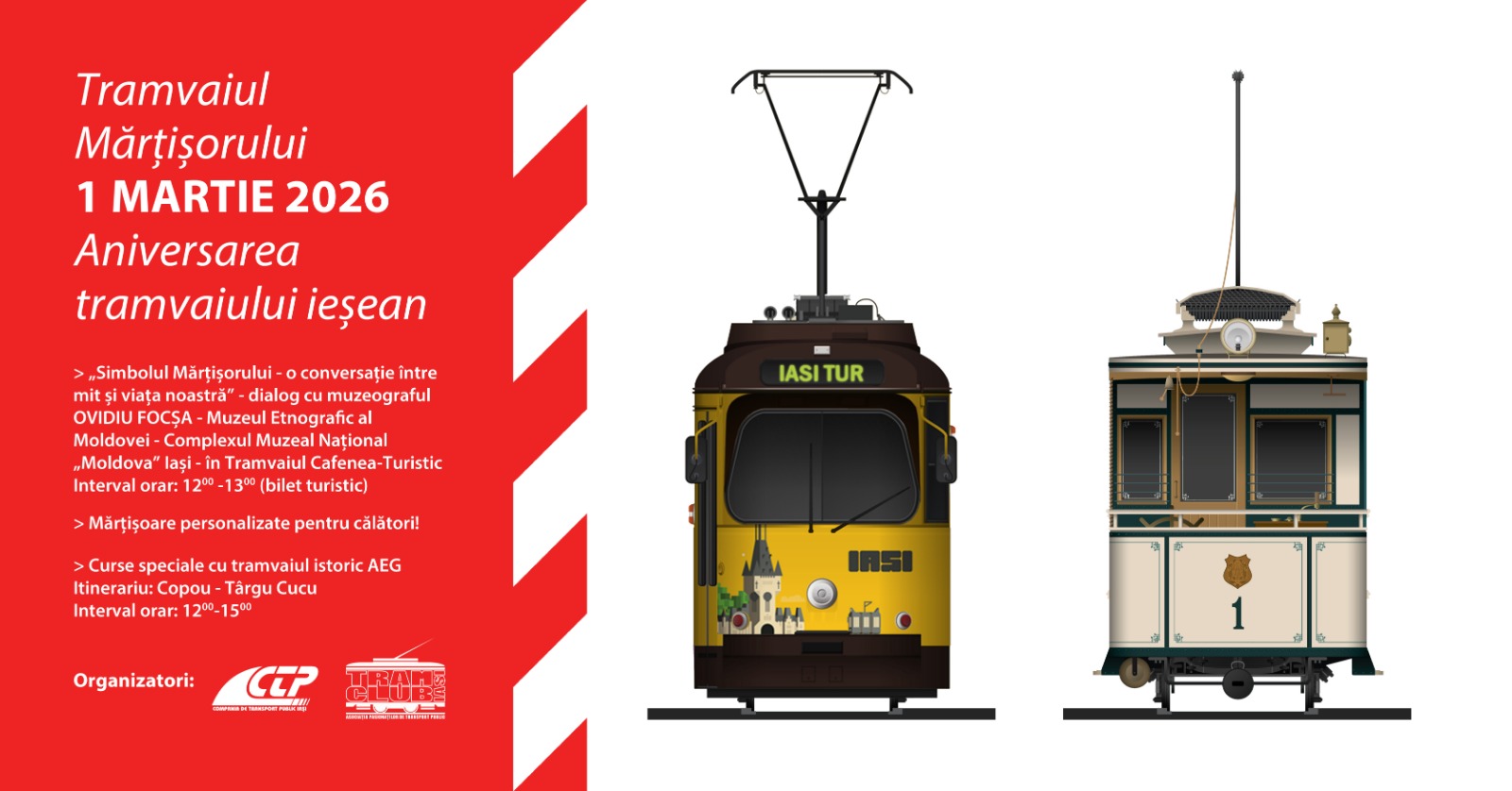 Duminică, 1 martie 2026, vă invităm să descoperiți Iașul din tramvaie cu istorie, cafea și dialoguri despre simbolul mărțișorului.