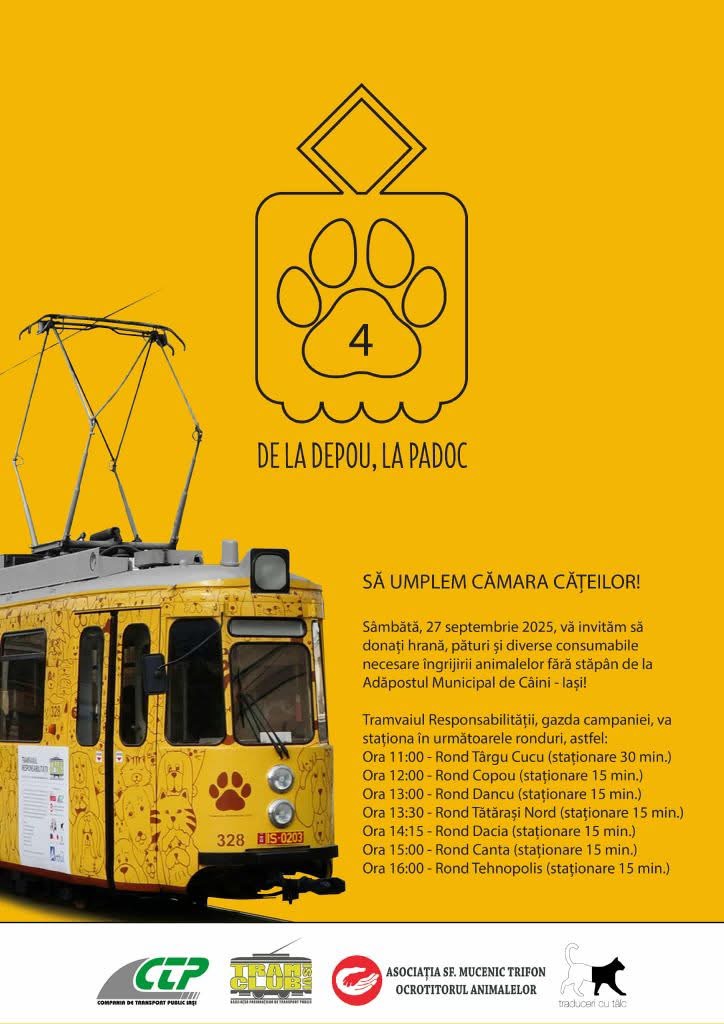 Sâmbătă, 27 septembrie 2025, ieșenii sunt invitați să se alăture unei inițiative inedite: Tramvaiul Responsabilității va circula prin oraș pentru a aduna hrană, pături și consumabile destinate Adăpostului Municipal de Câini din Iași.