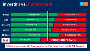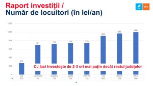 Consiliul Județean Iași va investi de două – trei ori mai puțin bani pe cap de locuitor, conform bugetului publicat. Mai mult, Costel Alexe susține un aparat administrativ supradimensionat, cu un număr de angajați de 2-3 ori mai mare decât personalul din alte județe.