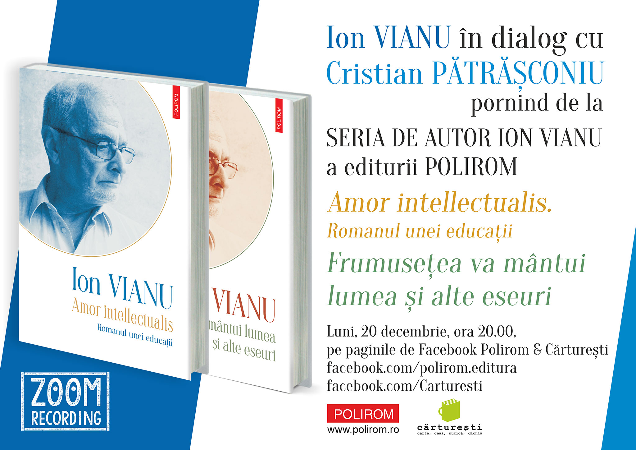 Luni, 20 decembrie 2021, la ora 20.00, pe paginile de Facebook Polirom & Cărturești (facebook.com/polirom.editura; facebook.com/Carturesti), vă invităm să urmăriți un dialog (înregistrat via ZOOM) între Ion Vianu și Cristian Pătrășconiu, pornind de la volumele cu care debutează cel mai recent proiect editorial Polirom, Seria de autor Ion Vianu: Amor intellectualis. Romanul unei educații și Frumusețea va mântui lumea și alte eseuri.